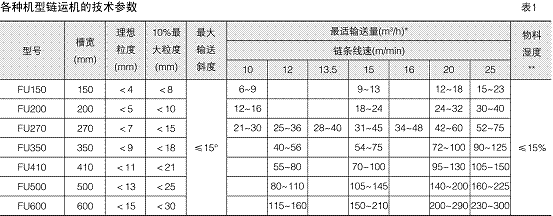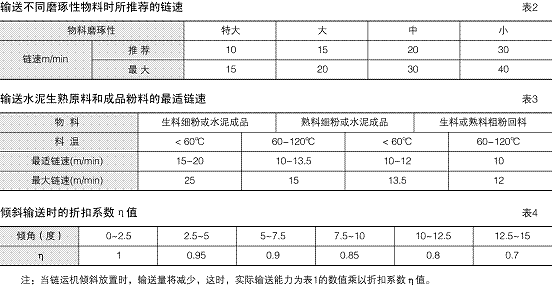 用戶應(yīng)根據(jù)物料的狀態(tài),先選擇適當(dāng)?shù)逆溗,鏈速選擇可參見后面表2、表3和各類機(jī)型選擇表,表5、表6諸如磨琢性強(qiáng)的物料,溫度高的物料,物料中粗大顆粒比較多的,及料粒大的物料宜選用慢速。對(duì)于水泥和生料最適鏈速可參照表3來選擇,其它與水泥性能和狀態(tài)相近的物料也可參照此表選擇。