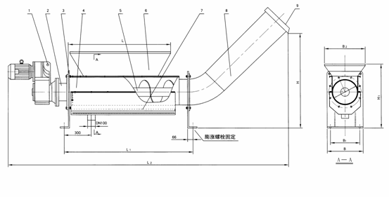 該設備采用有軸螺旋式,當物料從進料斗進入,通過螺旋體將柵渣推至出料管道內,依靠柵渣重力壓縮后推出出料口,直接排放至垃圾小車內外運,壓出的廢水通過濾網和集水管經排水管排出。
